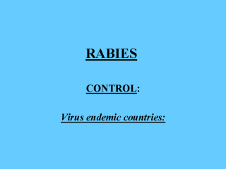 in Europe - (1) vaccination of domestic animals with inactivated or live attenuated vaccines; (2) b.Vaccination of wildlife. Has been effective in reducing the prevalence of rabies but as a consequence the fox population is increasing! Vaccines are either attenuated virus or a recombinant vaccinia vaccine. Fed in bait. A successful strategy in Europe. |