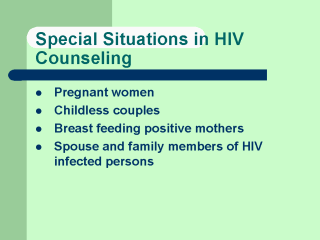 support and ability to understand the implications of having a child. Childless couples may be desperately needing a child. In such conditions, adoption as an option should be discussed. It becomes difficult to handle family members of positive persons. |