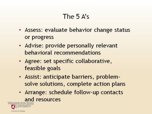 In essence, the 5A’s are a sequential series of steps that serve as ‘how-to’ guidelines for facilitating self-management. They have been extensively used in smoking cessation, but have also been found useful for helping patients self-manage chronic diseases.