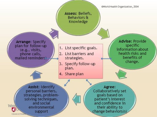 Reference: World Health Organization (2004). Self-management support for chronic conditions using 5A’s. Available at: http://www.who.int/diabetesactiononline/about/WHO 5A ppt.pdf |