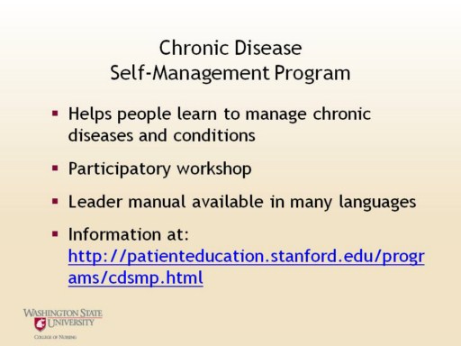 The Chronic Disease Self-Management Program was developed using Social Cognitive Theory and heavily draws on principles from Self-Efficacy Theory. As a result those who participate in either the “in person” or internet group workshops, increase their confidence in performing positive self-management behaviors. They also practice goal setting and enacting behaviors throughout the workshop such that they can become activated and engaged patients as described in the Chronic Care Model.