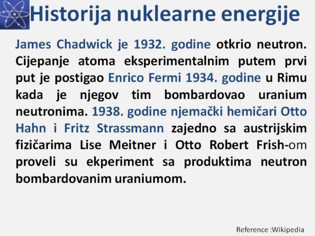 Utvrdili su da relativno mali neutron cijepa jezgru masivnog uraniuma na dva približno jednaka dijela, što je bio iznenađujući rezultat. Određen broj naučnika, uključujući i Leo Szilard-a koji je prvi uočio da se reakcijom cijepanja oslobađaju dodatni neutroni, koji su posljedica samo-održive reakcije nuklearnog lanca. Takvo otkriće potaklo je mnoge naučnike širom svijeta (SAD, Engleska, Francuska, Njemačka i SSSR) da traže potporu svojih vlada za istraživanje nuklearne fuzije. |