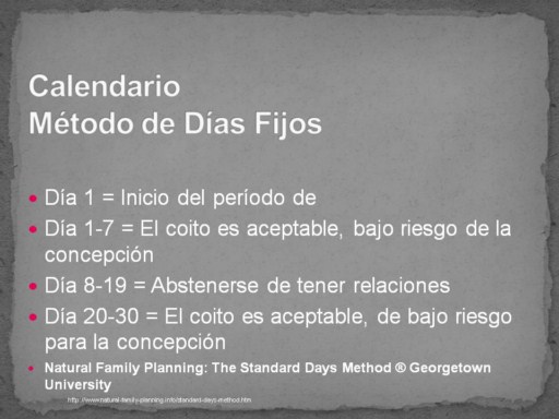 Calendario Método de Días Fijos o comienza con el primer día de su período. Esto se conoce como día 1. Día 1-7 = El coito es aceptable, bajo riesgo de la concepción.Luego, el día 08/19 que debe abstenerse de relaciones sexuales. Día 20-30 = El coito es aceptable, de bajo riesgo para la concepción. Este método no permite a las mujeres que son irregulares o están teniendo cambios, por lo que mediante el uso de este método con los otros dos métodos que usted será más preciso en la predicción de la ovulación.