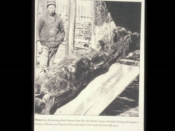 A typical late 19th century American urban scene-removing a dead horse from the city streets. |