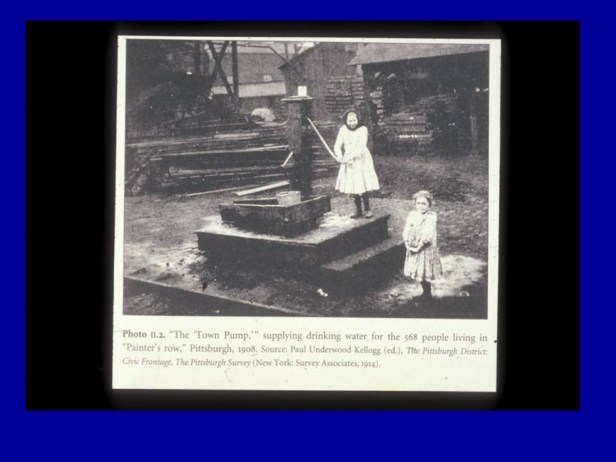 1908 “Painters Row” in Pittsburgh, PA. This town pump was the only drinking water for the 568 people living in this working class community. Many died of typhoid fever in the first decade of the 20th century. |