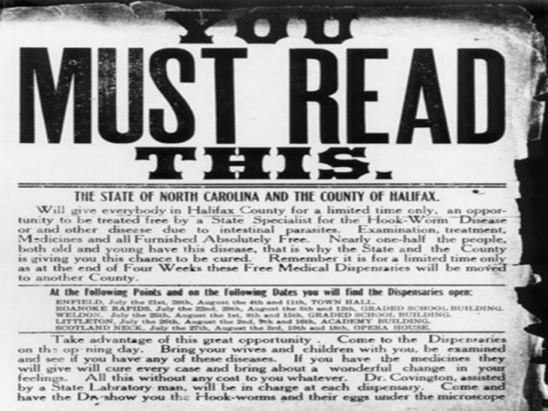 Poster advertising hookworm screening in North Carolina created by Rockefeller funding in the 1910’s. On October 26, 1909 the Rockefeller Sanitary Commission for the Eradication of Hookworm Disease was organized as a result of a gift of $1 million from John D. Rockefeller, Sr. The five-year program was a remarkable success and a great contribution to United States public health, instilling public education, medication, field work and modern government health departments in eleven southern states.