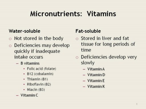 Water soluble vitamins are not stored, so these deficiencies appear more quickly than those associated with fat-soluble vitamins. Fat soluble vitamin deficiencies may take months or years to appear, where as water soluble vitamin deficiencies only take weeks to appear. |