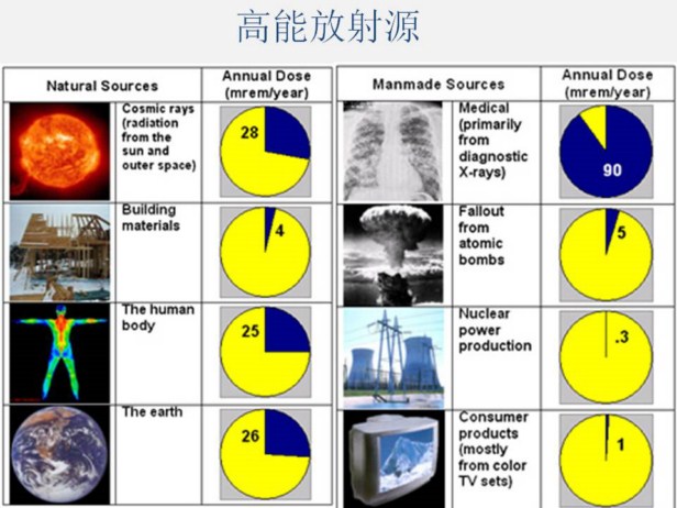 有害的高能射线有多种来源。工业放射照相师主要担心的是暴露于X射线发生器和放射性同位素。有一点非常有必要了解的是8%的放射暴露来自自然界,例如外界空间,岩石和土壤,氡气体,还有人体本身。另有20%来自人造放射源,如用于医疗诊断和牙科诊断的仪器。 其中一种自然射线是宇宙射线。地球和地球上的所有生物不断地受到来自宇宙的射线的轰击。太阳和其他恒星发射所有波长的电磁射线。来自太阳和其他星球的带电粒子与地球大气层和磁场相互作用,产生了一阵阵射线,一般是贝塔射线和伽马射线。地球上不同的位置接收的宇宙射线量不同,这主要是因为海拔不同,地球磁场对不同地球的影响不同。 放射活性物质分布于整个自然界,土壤、水、植物和动物中都有。陆地辐射令人担忧的同位素主要是铀及其衰变产物例如钍、镭和氡。低浓度的铀、钍及其衰变产物到处都能找到。一些通过进食喝水被人体摄入,一些像氡被吸入体内。陆地来源的射线量在地球的不同地方差别很大。土壤里有高浓度铀和钍的地区射线量就会更高。所有人的体内都有放射性同位素如钾-40和碳-14。不同人体内量的差别不像宇宙射线和陆地射线那么大。 公众还暴露于很多人造辐射源,包括烟草、电视机、烟雾探测器、可燃燃料、特定的建筑材料、产能的核燃料、核武器、医用和牙科X射线、核医学、X射线安全系统和工业放射照相术。到目前为止,对一般人影响最大的人造辐射来自医疗过程,例如诊断性的X射线,核医学和放疗。 http://www.ndt-ed.org/EducationResources/CommunityCollege/RadiationSafety/theory/sources.htm