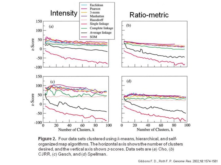 Hierachical Clustering and SOMs were done with uncentered Pearson Correlation. Also of note, is that the highest scores for the Gasch data are much higher than the for the other sets - this dataset has some diverse conditions. Ratio data, Euclidean distance is better |