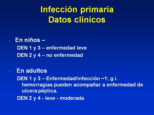Durante la primera infección, hay marcadas diferencias en la patogenicidad de los virus del dengue que se observan con la enfermedad, siendo más severa en adultos que en niños. |