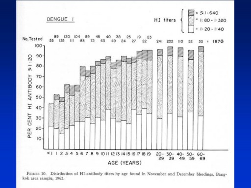 La endemicidad de las cuatro infecciones de dengue en Bangkok durante la década de 1960 dio lugar a esta prevalencia específica por edad, de anticuerpos contra dengue en una muestra grande seleccionados al azar. Aunque las tasas de infección varían notablemente en diferentes años (medido en el 42% en 1962) la tasa anual promedio de infección por dengue de un 15% produce esta curva de prevalencia. |