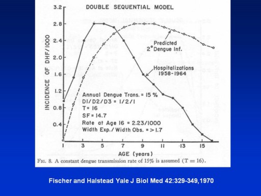 La distribución por edades de casos de dengue hemorrágico (Bangkok) está especialmente relacionada con infecciones secundarias de dengue. La línea de puntos de arriba es la distribución por edades pronosticado de casos durante una segunda infección por dengue asumiendo que todas las edades tienen un riesgo intrínseco igual a DH. |