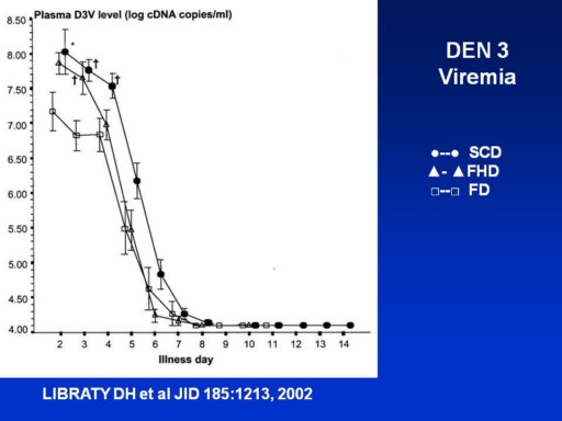 Titulaciones de virus en muestras de sangre en la fase aguda fueron examinadas por PCR cuantitativa. Viremias en el día 2 fueron 10 veces más elevadas en niños que posteriormente desarrollaron SCD que en aquellos sin FD.