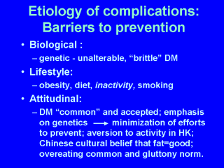 (based on a population of 7 million). As the population ages, this figure will increase. Thus, the importance of prevention is obvious. So, what are the barriers to preventing complications? There is nothing that can currently be done to alter genotype in adults, and this is not likely to be feasible in the foreseeable future. However, the complacent attitude brought about by "genome-hype" that all diseases will be cured by taking a pill gives most people no incentive to alter their behaviours. Immediate gratification almost always wins out over longer term self-restraint. So this attitude does make matters worse. For the next ten years at least, lifestyle factors will remain the main point for intervention. That means increasing activity and decreasing over-nutrition. |