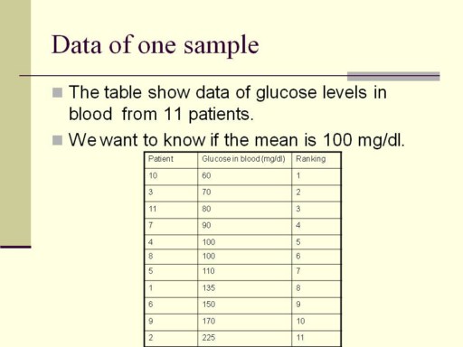 If we use a parametric method to know the answer to this question, we should assume that distribution of glucose levels in blood in this sample are approximately Normal and then, probe: Null hypothesis Ho: μ = 100 Alternative hypothesis H1: μ ≠ 100 Then we calculate a t-statistic test ( no Z) because the little sample size. _ Mean X = 117.27 s = 49.01 SE = 15.52 t = 1.11 P > 0.05 |