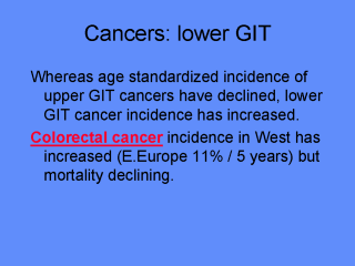 | In contrast to cancers of the upper GI tract, rates for cancers of the lower GI tract have tended to increase world-wide. Colorectal cancer incidence in western Europe has increased but better early detection and treatment have helped bring about a decline in mortality. Possible reasons for this increase include the decline in dietary fibre content, reduced consumption of fresh fruits and vegetables and increased protein consumption. |