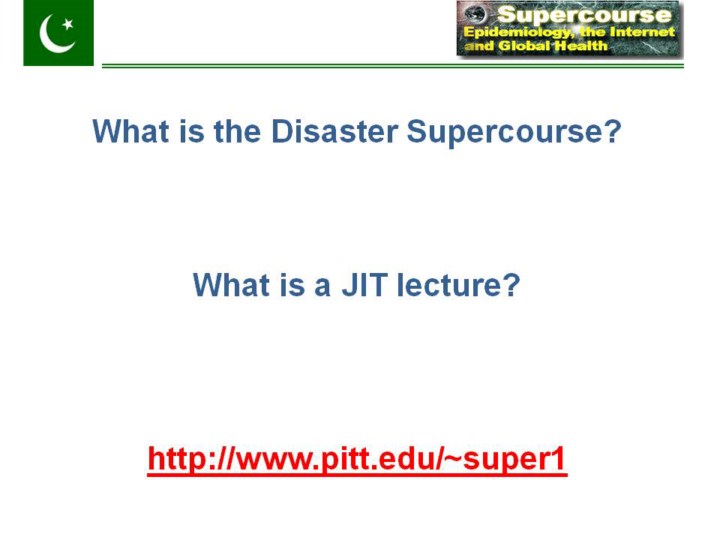 Just-in-time lecture: A JIT lecture is one of the special applications of the Disaster Supercourse blossoms when a major event happens around the world. These Cutting Edge Educational lectures aim to reduce fear and save lives by providing the best possible knowledge. In the field of disasters, continuous “CNN Type” PowerPoint lectures are provided on the science aspect of disasters and the epidemiology of their consequences.