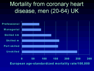 occupational groupings in the UK. What can you deduce from the chart? What explanations do you have for the gradations in mortality? Why should less money that your neighbour make you less healthy? It is easy to understand if you are living in poverty, but even when you are “middle class” and comfortable, this effect remains. |
