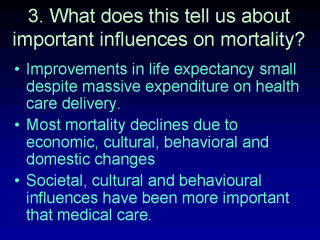 conclude from the data you have seen so far? 1. Despite the massive expenditure of health services delivery since WWII, the improvements in life expectancy have been meager and far short of what might be expected from the trillions of US$ spent. 2. Most of the declines in mortality from the mid 19th to the mid 20th Centuries were due to societal, cultural, behavioural, educational and domestic changes, many of which were driven by legislation. 3. Changes in the way people live their lives prove to be far more effective in changing mortality rates than does better and more expensive medical technology. Sometimes these changes can be as simple as providing education for girls, changing food preparation or making condoms available for family planning. |