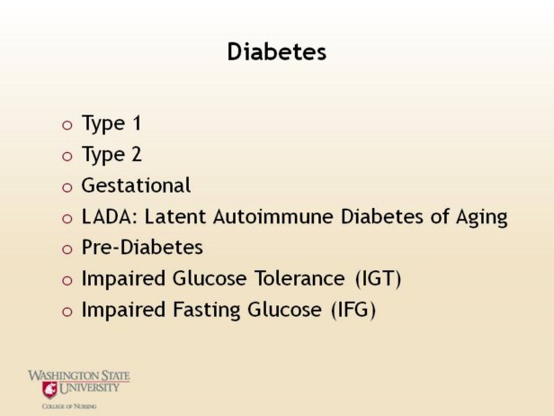 referred to as IGT and IFG. For the purpose of this presentation, the focus will be on Type 2 diabetes because of the large percentage of people with diabetes have Type 2 (90%)