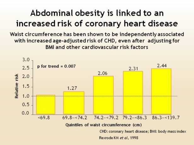 The prospective Nurses Health Study set out to assess the impact of factors such as waist circumference in determining risk of CHD in a cohort of 44,702 US female registered nurses, aged 40 to 65 years, recruited between 1986 and 1994. Study subjects were free of prior CHD at baseline. During 8 years of follow-up, there was a direct, independent and continuous relationship between waist circumference and age-adjusted risk of CHD. |