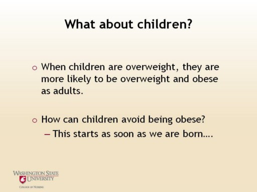With children, the challenges of obesity are even more important to recognize. When a child is overweight or obese, there is more likelihood of becoming obese as an adult….no matter where you live. More and more children are gaining too much weight. The next few slides will discuss the issues surrounding childhood obesity, starting with pregnancy and infants. How babies start in life is very important to being as healthy as possible. |