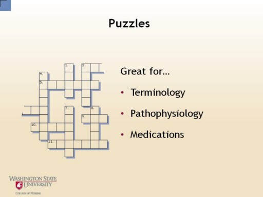 Puzzles are not hard to do. There are inexpensive programs available and some websites that offer free puzzle programs. All you need to do is put in the terms and the definitions. In addition to learning terminology and facts.