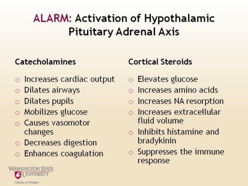 The fight-or flight response is initiated. Cells in the hypothalamus produce corticotropin-releasing hormone (CRF). CRF stimulates receptors on pituitary cells to secrete adrenocorticotropic hormone (ACTH). ACTH stimulates the adrenal glands. The adrenal glands secrete cortical hormones and catecholamines. Stress can cause physiological changes that, when sustained, will strain the body’s homeostatic mechanisms, leading to pathogenic conditions. Corticotropin Releasing Factor (CRF) is one of the master triggers of the stress response. Activation of the HPA Axis causes an elevation in catecholamines and cortisol levels. Excessive cortisol has been shown to damage the hippocampus, which is another mechanism that provides negative feedback to the HPA axis. Animal studies have shown that chronic stress results in suppression of neuorgenesis in the hippocampus. People with depression, a very stressful condition, have been shown by MRI to have decreased hippocampal volume. This is important because the hippocampus is involved in short term memory, learning, and contextual memory—helping bind memories together and understand the context. So damage to the hippocampus may impair the ability of a person to understand the stressor. Chronic stress has also been shown to decrease blood flow to the prefrontal cortex. The prefrontal cortex is important to help regulate inhibition. So the person under chronic stress may have a problem understanding the context of the problem, plus a problem controlling their inhibition. This can result in an inappropriate stress response (Southwick, 2007).