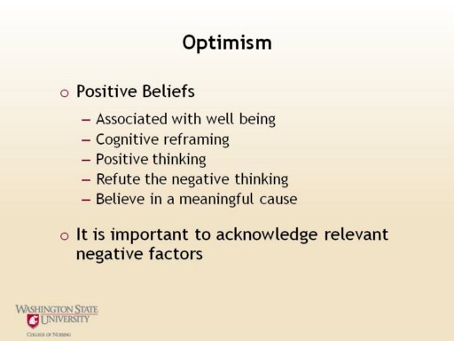 Optimists tend to readily engage in problem solving, which facilitates early resolution of the stress response. However optimism is not always associated with resilience. Some optimists hold on like a bulldog and won’t let go. It is important to recognize negative information and disengage when the situation is untenable (Sowthwick, 2007). |