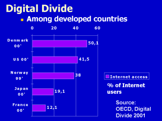 shows digital divide among developed countries: Source – OECD, Digital Divide, 2001 50% of Denmark population has internet access. In France, only 12%. Digital divide even among developed countries seems to be quite obvious.