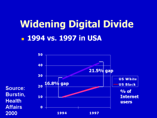 Burstin, Health Affairs, 2000 This data shows that the difference of internet access among the US white and black in 1994 was only 17% difference. But in 1997 it’s 22% difference. Digital divide is more widening even in the world largest Internet user country.