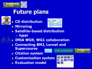 major issues we are working on currently: We will continue the CD distribution and mirroring worldwide. A satellite-based lectures distribution system is on discussion with Egypt. International Medical Informatics Association, Workgroup 9 - Health Informatics in Developing Countries, is also a partner of the Supercourse lecture distribution. Supercourse utilization: - The BMJ and Lancet articles will be linked to the Supercourse lectures. Teachers will