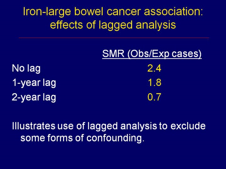 Building a lag period into the analysis can correct for treatment of cancer symptoms with a drug before the cancer is diagnosed. The substantial association of iron medication with cancer of the large bowel was reduced with a 1-year lag and totally removed with a 2-year lag. |