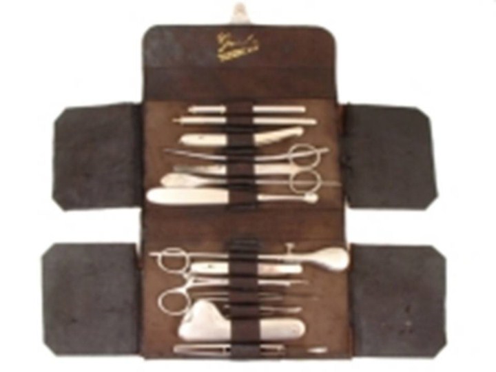 With the hard and often dangerous life on the frontier, surgery was a constant fact of medical life. The common surgeon's tools were a set of amputation instruments, trepanning tools, crooked and straight needles, a scalpel or incision knife, and his own traveling drug store, which he kept in his saddlebags. |