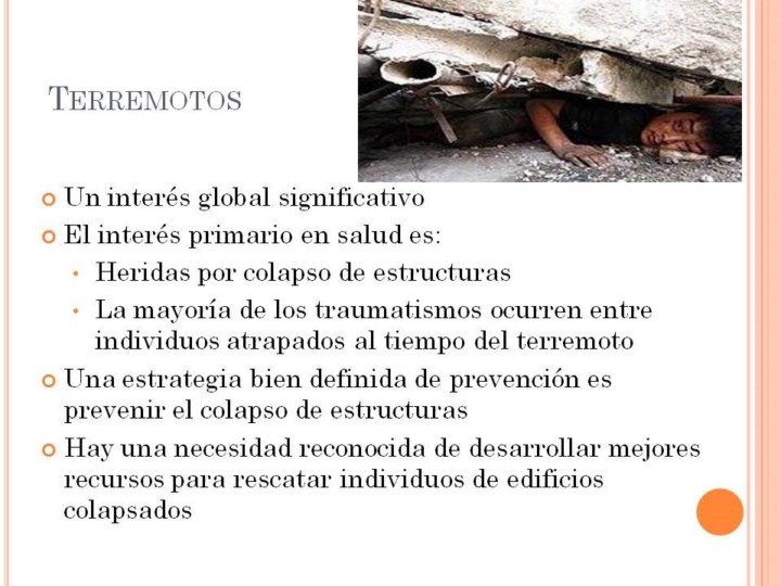 Traumatismos de cabeza y tórax, así como fracturas son comunes entre víctimas de los terremotos. La enfermera posee las herramientas clónicas que puedan salvar vidas cuando ayudan en búsqueda y rescate de individuos atrapados. También la tasa de traumatismos es lata para respondientes , y las enfermeras pueden tener un rol en la protección de equipos de rescate. De hecho, todos los equipos de rescate deberían tener al menos a una enfermera. |