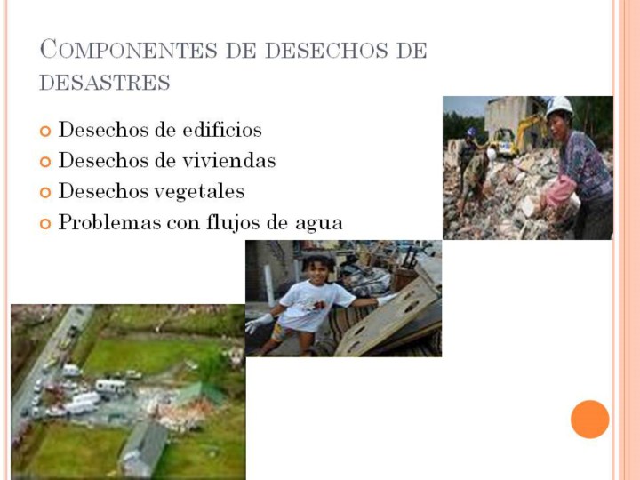 Traumatismos severos pueden ser causados por desechos del desastre. Limpieza de desechos es responsabilidades de las autoridades pero las enfermeras pueden asumir el rol de educadores incrementando la conciencia de público de los peligros de los desechos y medidas precautorias para proteger la seguridad propia y de su familia. Las enfermeras también tienen un papel principal en la mitigación a largo plazo o con la reconstrucción. |
