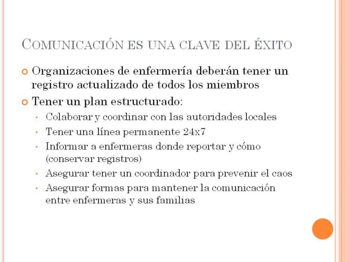 Organizaciones de enfermería tienen la responsabilidad de coordinar con los oficiales en tener un claro entendimiento de los roles de las enfermeras durante el desastre y tomando todas las medidas para el rápido involucramiento de todas las enfermeras en tiempos de crisis. Enfermeras pueden integrar en un equipo ya existente o forma uno si no lo hay en el sitio. Y documentar lo que hacen para la continuidad con cada paciente o registrar a donde fueron enviados los heridos. |