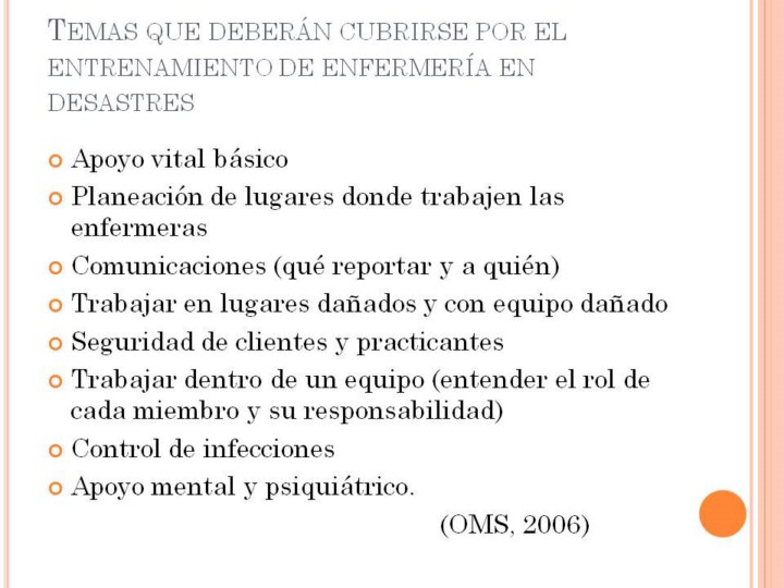 Organización Mundial de la Salud (2006). La contribución de enfermería y partería en emergencias. Ginebra, Suiza.