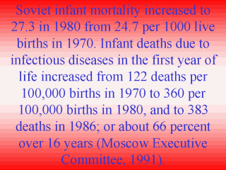 | The number of new cases of infectious diseases, such as acute poliomyelitis, pertussis, diphtheria, and measles, increased from a low in the mid-1960s to a new high in 1981-1982 (Feshbach, 1985b). Alcohol consumption accounted for 20 percent of all premature mortality in 1980 and for 30 percent of household budgetary expenditures in one-fourth of Russian, Ukrainian, and Belorussian households (Schultz and Rafferty, 1990). |