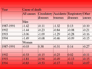 1987-1994, by sex (in years) (source: adapted from Vishnevsky, Naselenie Rossi, 1995, pp.72) The Russian mortality crisis has been associated with various theories of the east-west health gap previously listed: socioeconomic transformation; environmental pollution; lack of an adequate social safety net; relative poverty and socioeconomic deprivation; historical, generational effects of a Soviet heritage; regional disparities; psychosocial stress; and individual lifestyle – poor health practices and violent behavior. |