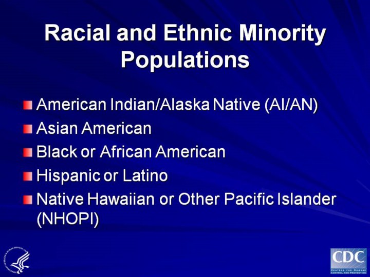 Sources: CDC’s Office of Minority Health (and Health Disparities), Definitions of Racial and Ethnic Populations, http://www.cdc.gov/omhd/populations/definitions.htm