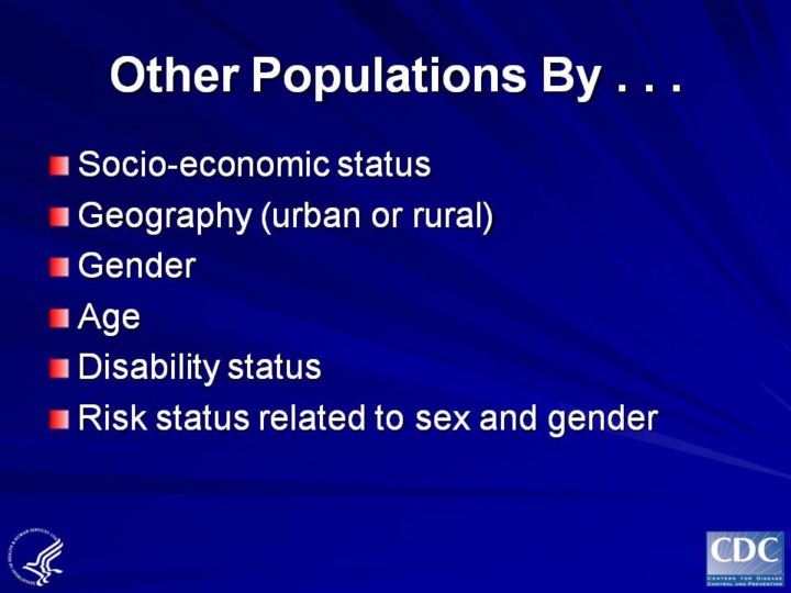 Health disparities have been described among other Populations By . . . (insert definitions when they become available) -- Socio-economic status -- Geography (urban or rural) -- Gender -- Age -- Disability status -- High-risk status related to sex and gender