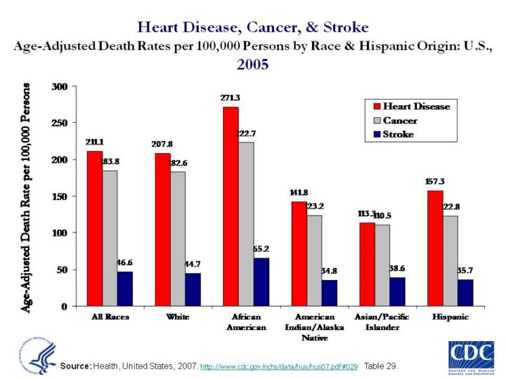 African Americans have a higher cancer death rate than white Americans, even though white Americans have a higher prevalence of cancer -- 7.8% for whites, compared to 3.4% for African Americans. This suggests some racial disparity in cancer screening and/or treatment. (10)
