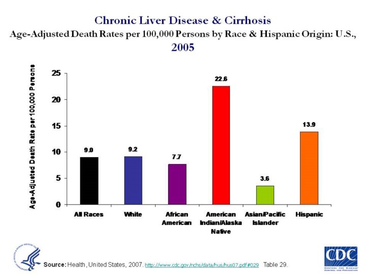 Updated 6/2/08 by SB. Age-Adjusted Death Rates per 100,000 Persons by Race & Hispanic Origin for Chronic Liver Disease & Cirrhosis: U.S., 2002 Analysis shows a strong correlation between death rates from liver cirrhosis, regardless of cause, and drinking levels nationwide. Consistent with this association, deaths from chronic liver disease and cirrhosis are about 4 times more prevalent among American Indians/Alaska Natives (AI/ANs) than among the general US population. However Hispanics/Latinos are approximately twice as likely as whites to die from cirrhosis or liver disease, despite a lower prevalence of drinking and heavy drinking. (19)