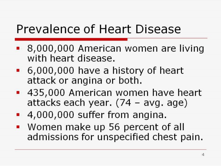Prevalence: Eight million American women are living with heart disease – 10% of women ages 45 - 64 have heart disease and the percent increases to 25% by age 65 and over. Six million women today have had a heart attack, angina or both. Nearly 13% of women age 45 and over have had a heart attack. 435,000 American women have heart attacks each year; Their average age is 74 but nine thousand women have a heart attack before they are 45 years old. Four million women suffer from angina, and women make up 56 percent of all admissions for unspecified chest pain.