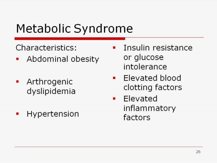 Metabolic syndrome refers to a group of symptoms that occur together and promote the development of coronary artery disease, stroke, and type 2 diabetes. Metabolic syndrome is becoming more common in the United States. More than 50 million Americans are estimated to have the condition. Characteristics include: Abdominal obesity Arthrogenic dyslipidemia (Arthrogenic dyslipidemia is high triglycerides, low HDL cholesterol and high LDL cholesterol) Hypertension Insulin resistance or glucose intolerance Elevated blood clotting factors (e.g., high fibrinogen or plasminogen activator inhibitor–1 in the blood) Elevated C-reactive protein [CRP] that causes inflammation |