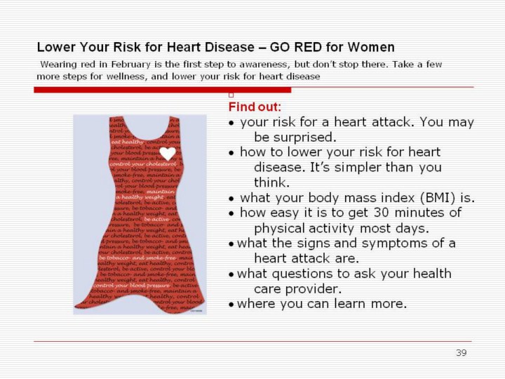 Wearing red on National Wear Red Day is one step in becoming aware that Heart disease is the #1 killer of women. We want to take that information further and find out your risk for a heart attack. You may be surprised. We will discuss · how to lower your risk for heart disease. It’s simpler than you think. · what your body mass index (BMI) is. · how easy it is to get 30 minutes of physical activity most days. · what the signs and symptoms of a heart attack are. · what questions to ask your health care provider and · where you can learn more.