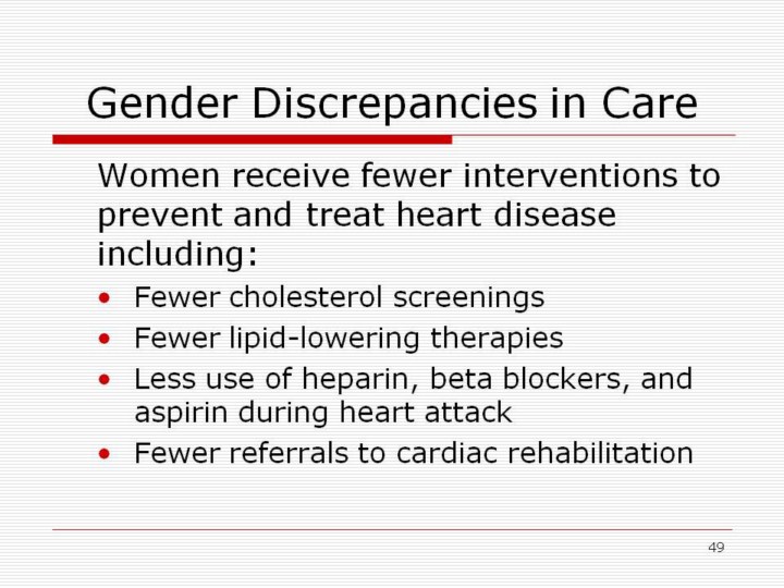 appropriate treatment at the appropriate time. Women receive fewer interventions to prevent and treat heart disease including: Fewer cholesterol screenings Fewer lipid-lowering therapies Less use of heparin, beta blockers, and aspirin during heart attack Fewer referrals to cardiac rehabilitation