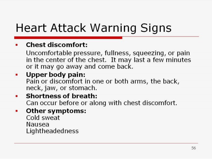What are considered to be typical warning signs leading up to a heart attack are the result of angina caused by inadequate blood flow to the heart muscle. It may feel like a pressing or squeezing pain, often in the chest, but sometimes in the shoulders, arms, neck, jaw, or back. And may be accompanied by shortness of breath, cold sweat, nausea or lightheadedness.