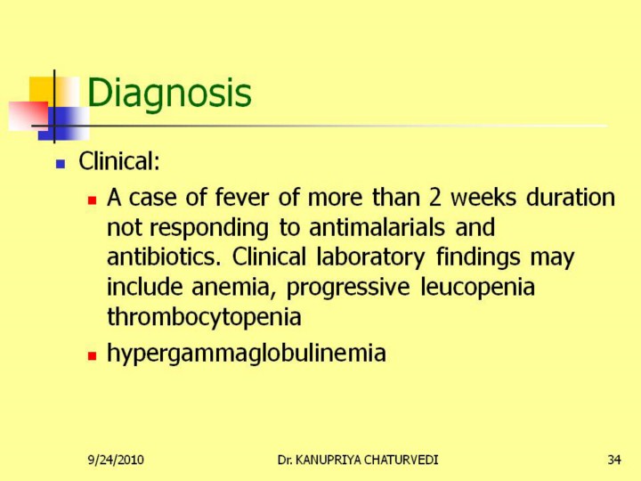 Serology tests: Variety of tests are available for diagnosis of Kala-azar. The most commonly used tests based on relative sensitivity; specificity and operationally feasibility include Direct Agglutination Test (DAT), rk39 dipstick and ELISA. However all these tests detect IgG antibodies that are relatively long lasting. Aldehyde Test is commonly used but it is a non-specific test. IgM detecting tests are under development and not available for field use. Parasite demonstration in bone marrow/spleen/lymphnode aspiration or in culture medium is the confirmatory diagnosis. However, sensitivity varies with the organ selected for aspiration. Though spleen aspiration has the highest sensitivity and specificity (considered gold standard) but a skilled professional with appropriate precaustions can perform it only at a good hospital facility.